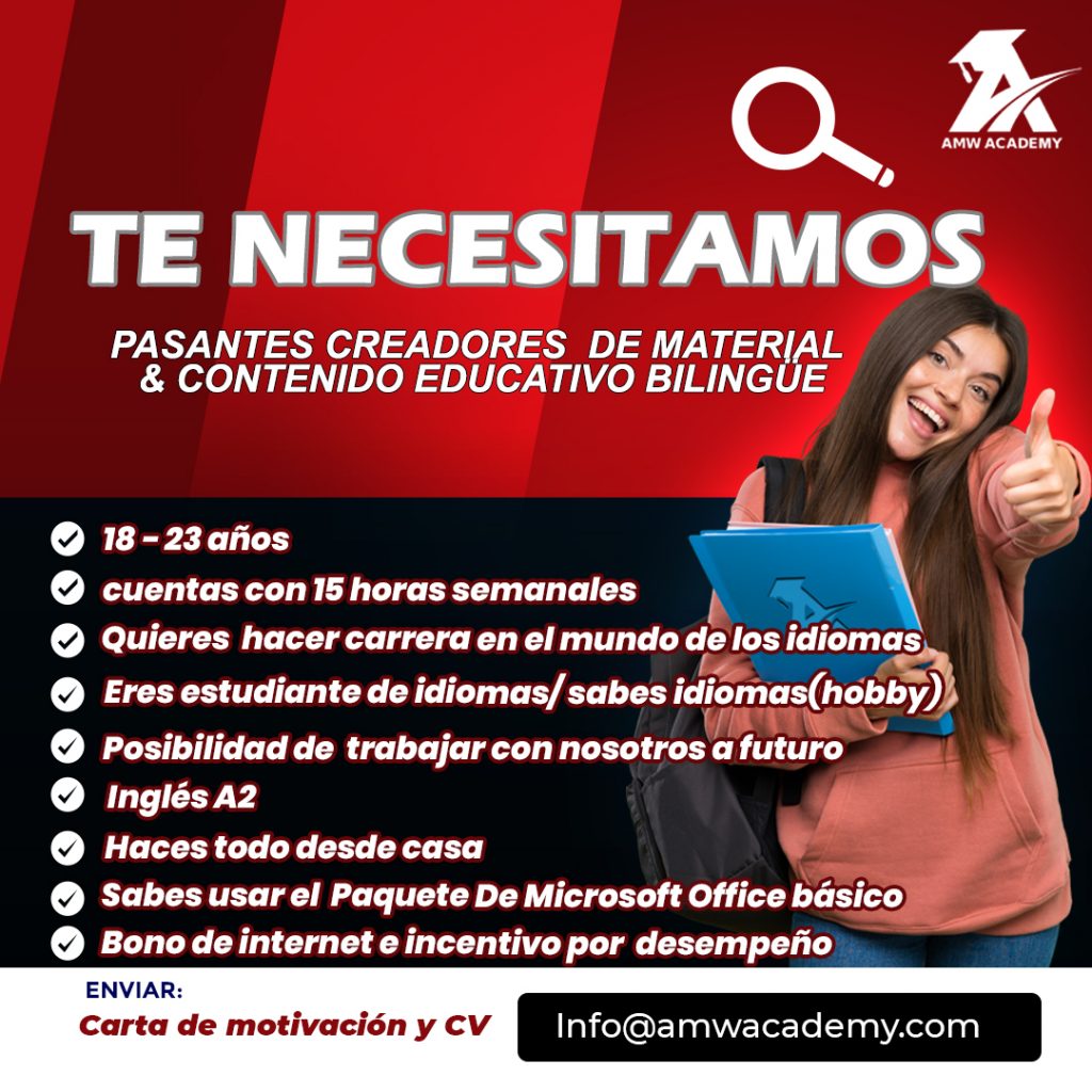 Work With Us Email Address Info@amwacademy.com Become a Teacher Envíanos tu CV! No olvides describir en tu CV tus principales cualidades, poner una foto actual, tu disponibilidad horaria y referencias laborales con datos.